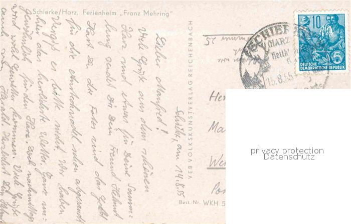 72676082 alte Postkarte Schierke Harz Ferienheim Franz Mehring postalisch gelaufen Erhaltung siehe scans [FriedD77] KatCode: 11110015085275