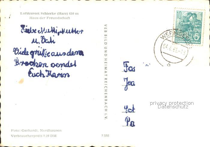 72190602 alte Postkarte Schierke Harz Haus der Freundschaft postalisch gelaufen Erhaltung siehe scans KatCode: 11110015085275