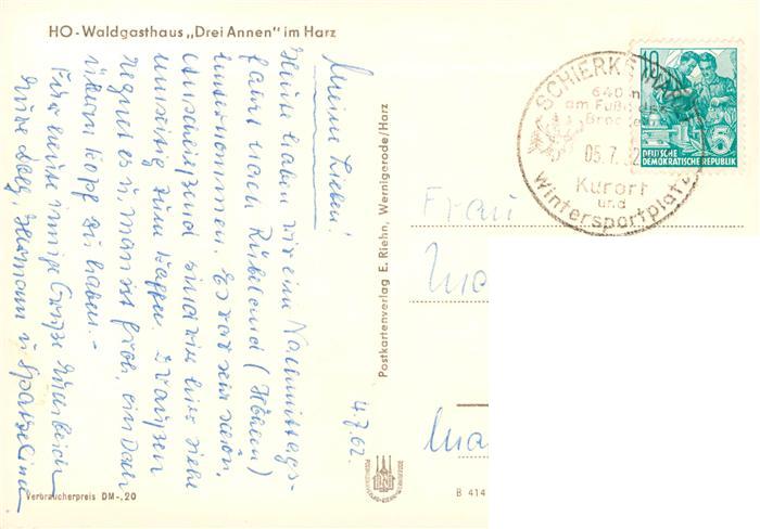 73904988 alte Postkarte Schierke Harz HO Waldgasthaus Drei Annen postalisch gelaufen Erhaltung siehe scans [WerneD78] KatCode: 11110015085275