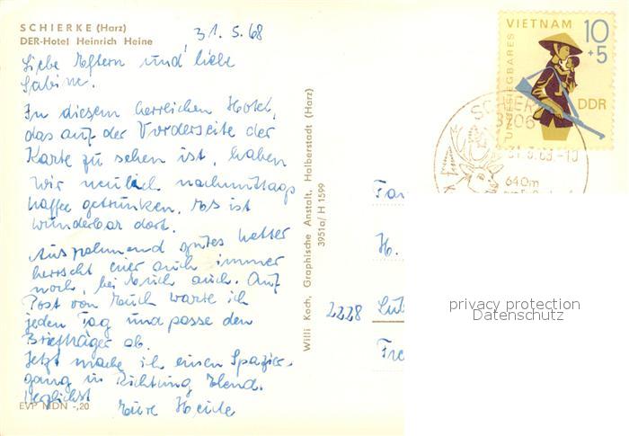 73144883 alte Postkarte Schierke Harz Hotel Heinrich Heine postalisch gelaufen Erhaltung siehe scans [NatalD47] KatCode: 11110015085275