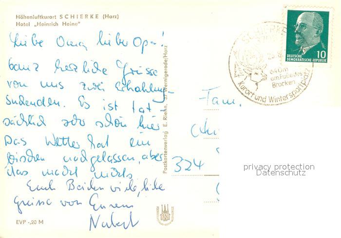 73741082 alte Postkarte Schierke Harz Hotel Heinrich Heine Aussenansicht postalisch gelaufen Erhaltung siehe scans [LiesaD40] KatCode: 11110015085275