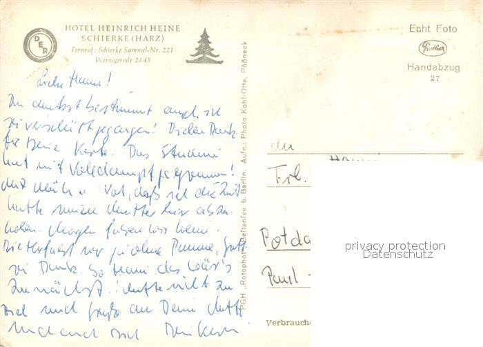 73715305 alte Postkarte Schierke Harz Hotel Heinrich Heine Handabzug postalisch gelaufen Erhaltung siehe scans [FriedD77] KatCode: 11110015085275