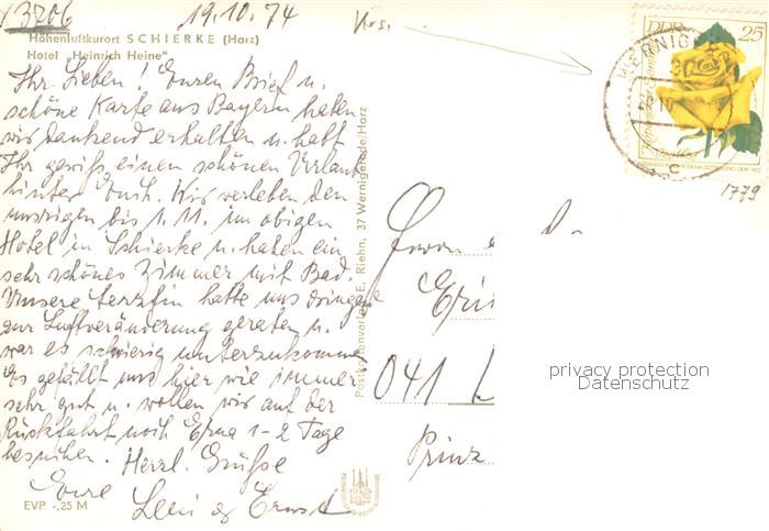 73759350 alte Postkarte Schierke Harz Hotel Heinrich Heine postalisch gelaufen Erhaltung siehe scans [FriedD77] KatCode: 11110015085275