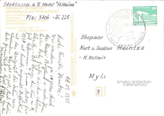 72393608 alte Postkarte Schierke Harz Rathaus Kirchberg Erholungsheim August Bebel postalisch gelaufen Erhaltung siehe scans KatCode: 11110015085275