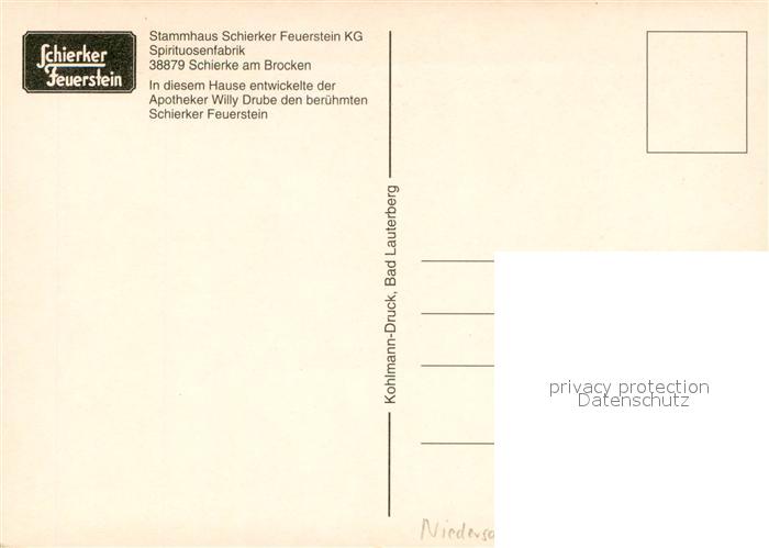 73641058 Schierke Harz Stammhaus Schierker Feuerstein KG Spirituosenfabrik postalisch nicht gelaufen Erhaltung siehe scans [WerneD78] KatCode: 11110015085275