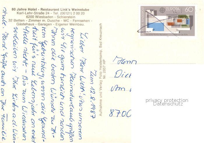 73862940 alte Postkarte Schierstein Hotel Restaurant Link’s Weinstube Gastraeume postalisch gelaufen Erhaltung siehe scans [WerneD78] KatCode: 11110006414000