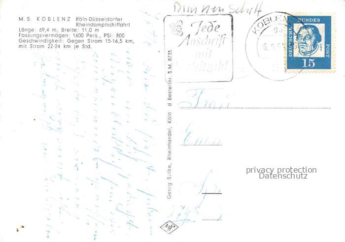 74051347 alte Postkarte Schiffe Binnenschifffahrt M.S. Koblenz Koeln Duesseldorf Rheindampfer postalisch gelaufen Erhaltung siehe scans [SanaeD93] KatCode: 22480000000100