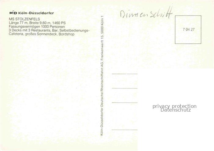 74051351 Schiffe Binnenschifffahrt MS Stolzenfels Koeln Duesseldorf postalisch nicht gelaufen Erhaltung siehe scans [SanaeD93] KatCode: 22480000000100