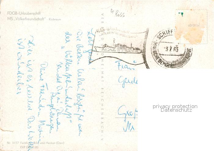alte Postkarte Schiffe Ships Navires FDGB Urlauberschiff MS Voelkerfreundschaft Klubraum postalisch gelaufen Erhaltung siehe scans [WerneD78]