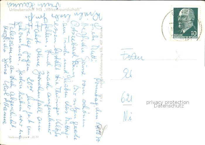 alte Postkarte Schiffe Ships Navires MS Voelkerfreundschaft postalisch gelaufen Erhaltung siehe scans [PaolaD17 kt110box]