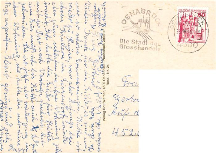 73924901 alte Postkarte Schinkel Osnabrueck Wochenmarkt Pauluskirche Campingplatz Niedersachsenhof Rosenkreuz-Kirche Schinkelbad VfL Stadion Bremer Bruecke Schuetzenstrasse Heilig Kreuz Kirche postalisch gelaufen Erhaltung siehe scans [FriedD77] KatCode: 11110003404000