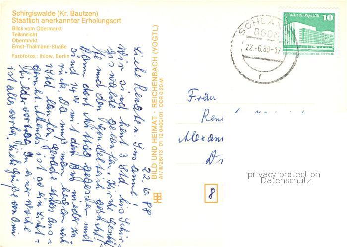 73606679 alte Postkarte Schirgiswalde Blick vom Obermarkt Teilansicht Ernst Thaelmann Strasse postalisch gelaufen Erhaltung siehe scans [WerneD78] KatCode: 11110014272320