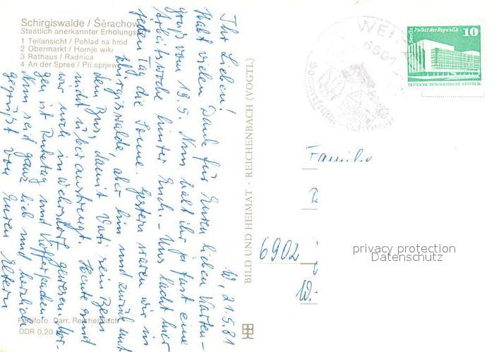 73061735 alte Postkarte Schirgiswalde Teilansicht Obermarkt Rathaus Spree Bruecke Kirche postalisch gelaufen Erhaltung siehe scans [FriedD77] KatCode: 11110014272320