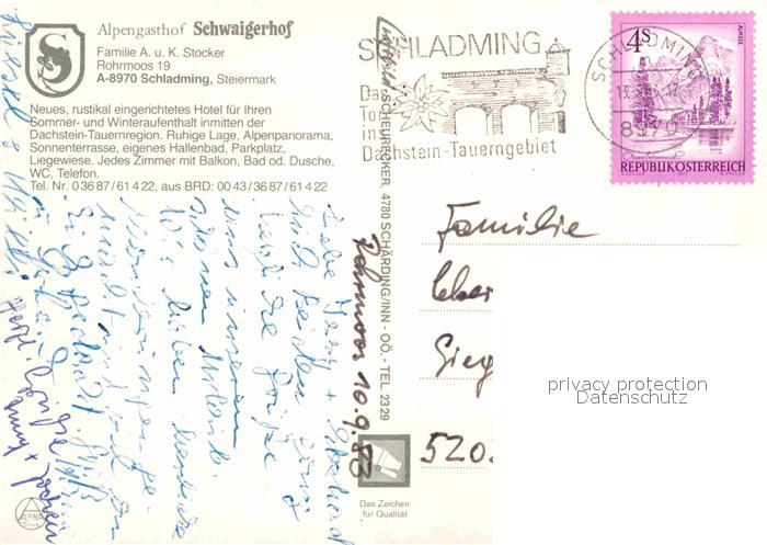 72791237 alte Postkarte Schladming Obersteiermark Alpengasthof Schwaigerhof postalisch gelaufen Erhaltung siehe scans [LiesaD40] KatCode: 11390222061242