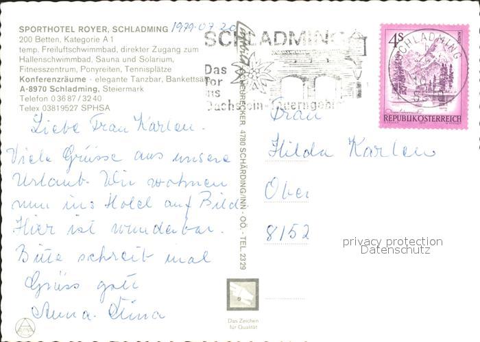 72294522 alte Postkarte Schladming Obersteiermark Sporthotel Royer Schwimmbad postalisch gelaufen Erhaltung siehe scans KatCode: 11390222061242