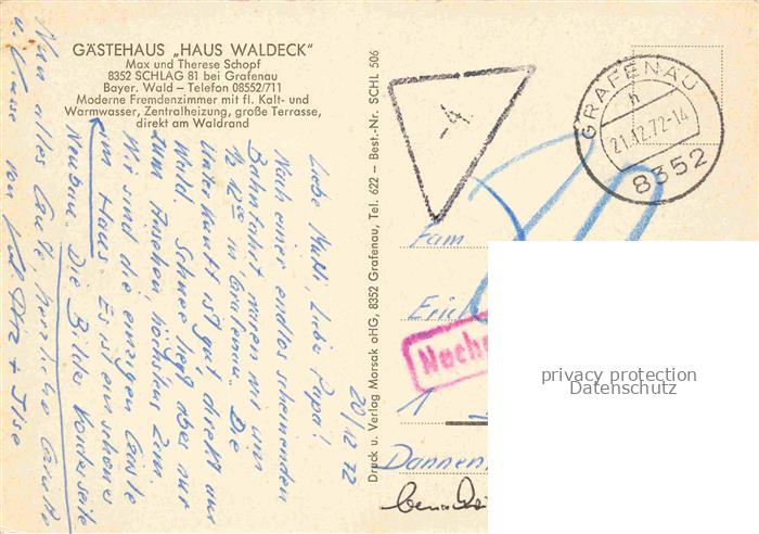 74036457 alte Postkarte Schlag Grafenau Gaestehaus Haus Waldeck Panorama postalisch gelaufen Erhaltung siehe scans [FriedD77] KatCode: 11110009272120