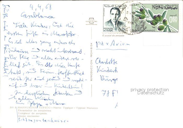 alte Postkarte Schlangen Tiere Schlangenbeschwoerer Typen Marokko postalisch gelaufen Erhaltung siehe scans