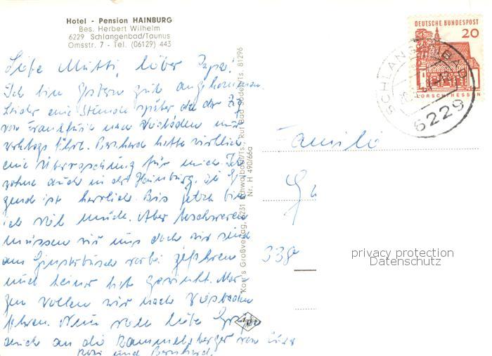 73762776 alte Postkarte Schlangenbad Taunus Hotel Pension Hainburg Terrasse Gaststube postalisch gelaufen Erhaltung siehe scans [FriedD77] KatCode: 11110006439014