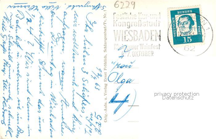 73696460 alte Postkarte Schlangenbad Taunus Panorama Kurgarten Kurhotel Thermalschwimmbad Sanatorium Landschaftspanorama postalisch gelaufen Erhaltung siehe scans [FriedD77] KatCode: 11110006439014