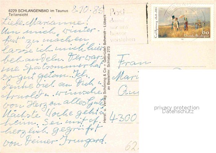 72840631 alte Postkarte Schlangenbad Taunus Teilansicht mit Kirche Bilderrahmen postalisch gelaufen Erhaltung siehe scans [FriedD77] KatCode: 11110006439014