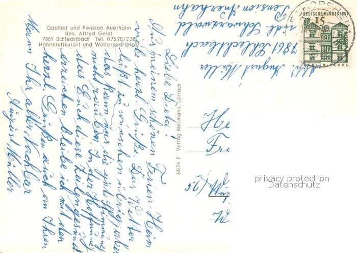 73660991 alte Postkarte Schlechtbach Schopfheim Gasthof Pension Auerhahn Gaststaette Terrasse Landschaftspanorama postalisch gelaufen Erhaltung siehe scans [FriedD77] KatCode: 11110008336081