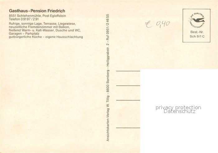 73654443 Schlehenmuehle Egloffstein Gasthof Pension Friedrich postalisch nicht gelaufen Erhaltung siehe scans [FriedD77] KatCode: 11110009474124