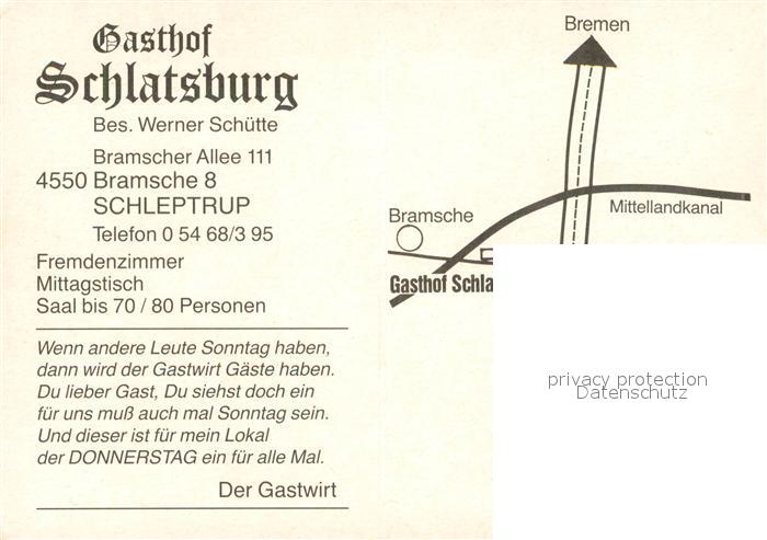 73614919 Schleptrup Gasthof Schlatsburg Gastraeume Bar postalisch nicht gelaufen Werbekarte (keine Postkarte) Erhaltung siehe scans [WerneD78] KatCode: 11110003459014
