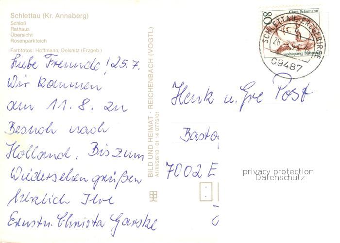 72932455 alte Postkarte Schlettau Erzgebirge Schloss Rathaus Panorama Rosenparteich postalisch gelaufen Erhaltung siehe scans [WerneD78] KatCode: 11110014171260