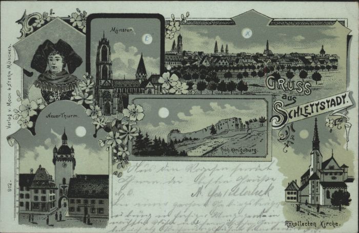 10868502 Schlettstadt Tracht Münster Neuer Turm Hohkönigsburg Kirche Mondscheinkarte Litho x KatCode 11170067567462