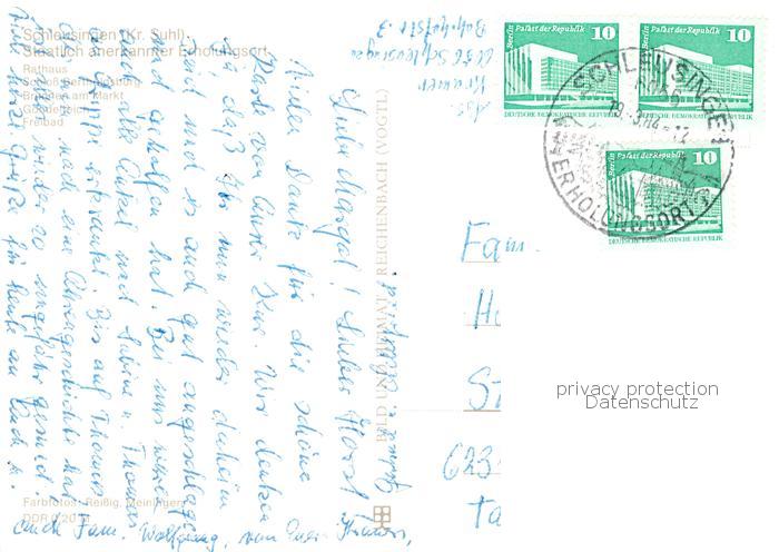 73871034 alte Postkarte Schleusingen Rathaus Schloss Bertholdsburg Brunnen am Markt Gondelteich Freibad postalisch gelaufen Erhaltung siehe scans [WerneD78] KatCode: 11110016069043