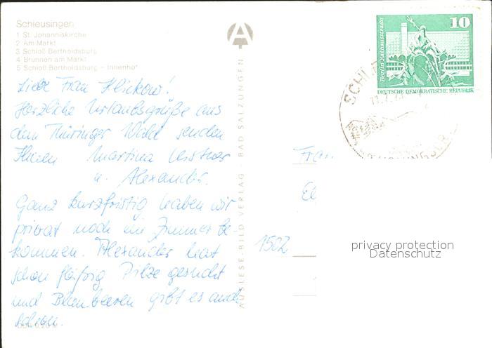 72320157 alte Postkarte Schleusingen St. Johanniskirche Markt Schloss Bertholdsburg postalisch gelaufen Erhaltung siehe scans KatCode: 11110016069043
