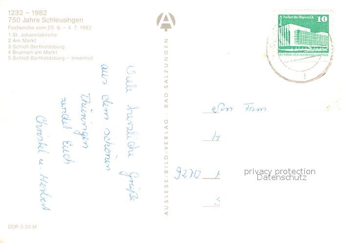 72972652 alte Postkarte Schleusingen St Johanniskirche Markt Schloss Bertholdsburg Brunnen postalisch gelaufen Erhaltung siehe scans [FriedD77] KatCode: 11110016069043