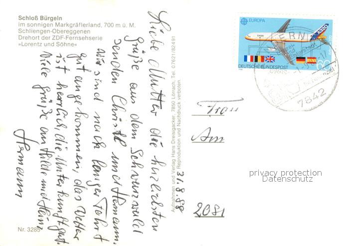 72941112 alte Postkarte Schliengen Schlo? B?rgeln postalisch gelaufen Erhaltung siehe scans [LiesaD40] KatCode: 11110008336078