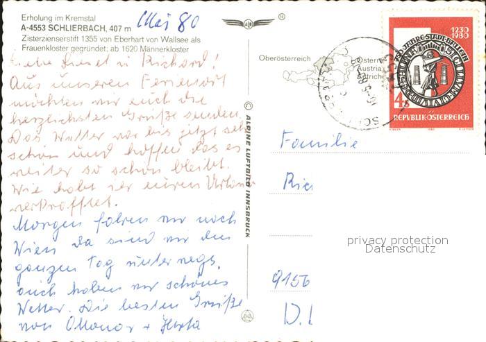72517892 alte Postkarte Schlierbach Oberoesterreich Fliegeraufnahme Zisterzienserstift postalisch gelaufen Erhaltung siehe scans KatCode: 11390314040917