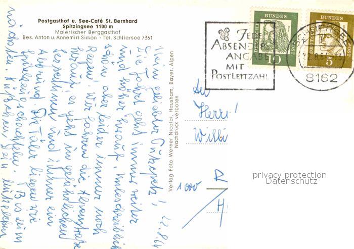 72914010 alte Postkarte Schliersee Postgasthof See Cafe Sankt Bernhard Spitzingsee postalisch gelaufen Erhaltung siehe scans [KathaD81] KatCode: 11110009182131
