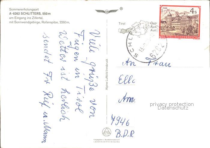 72238726 alte Postkarte Schlitters Tirol Eingang ins Zillertal Sonnwendgebirge Rofanspitze Fliegeraufnahme postalisch gelaufen Erhaltung siehe scans KatCode: 11390335070925