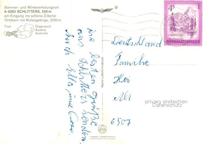 73363383 alte Postkarte Schlitters Tirol Ortskern mit Rofangebirge Fliegeraufnahme postalisch gelaufen Erhaltung siehe scans [FriedD77] KatCode: 11390335070925