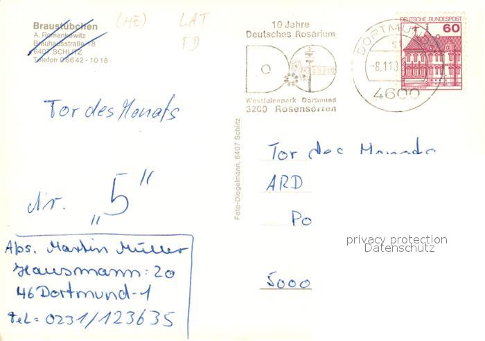 73323304 alte Postkarte Schlitz Braustuebchen Gaststaette Altstadt Turm postalisch gelaufen Erhaltung siehe scans [FriedD77] KatCode: 11110006535015