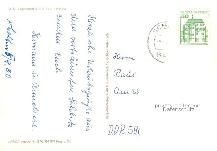 73619875 alte Postkarte Schlitz Burgenstadt Fliegeraufnahme postalisch gelaufen Erhaltung siehe scans [WerneD78] KatCode: 11110006535015