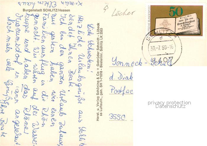 73209947 alte Postkarte Schlitz Fliegeraufnahme mit Burg Schlitz postalisch gelaufen Erhaltung siehe scans [WerneD78] KatCode: 11110006535015