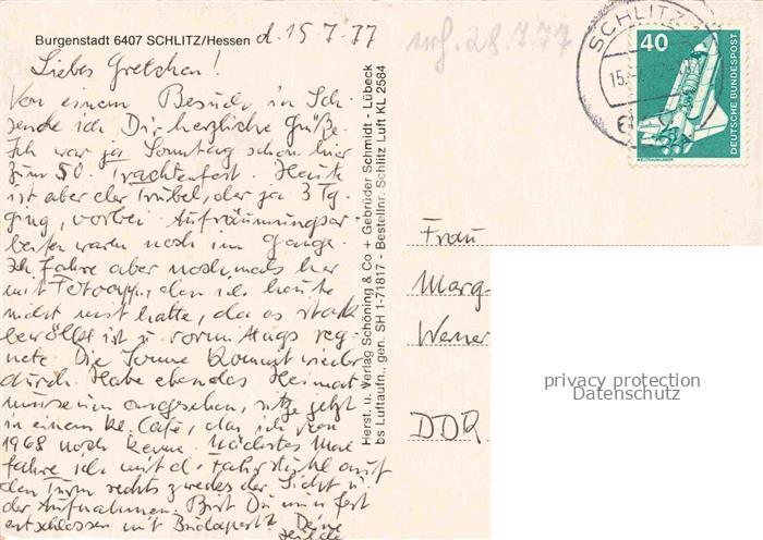 74096016 alte Postkarte Schlitz Hessen Burgenstadt Fliegeraufnahme postalisch gelaufen Erhaltung siehe scans [WerneD78] KatCode: 11110006535015