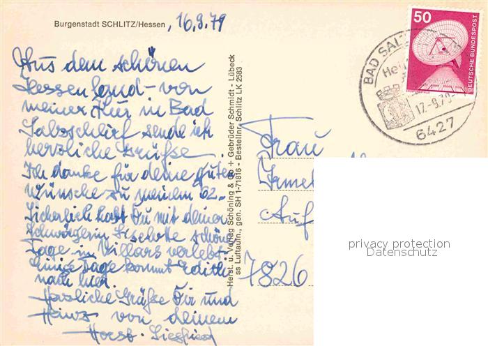 72818599 alte Postkarte Schlitz Hessen Fliegeraufnahme postalisch gelaufen Erhaltung siehe scans [NatalD47] KatCode: 11110006535015