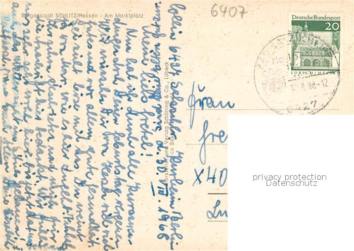 73691858 Schlitz Hessen Marktplatz mit Brunnen postalisch gelaufen Erhaltung siehe scans [WerneD78] alte Postkarte Wern Katcode 11110006535015