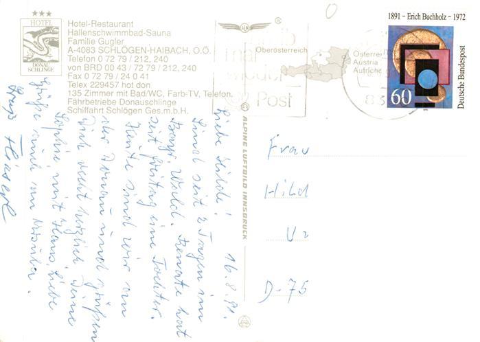 alte Postkarte Schloegen Haibach Donau Oberoesterreich AT Hotel Donauschlinge postalisch gelaufen Fliegeraufnahme Erhaltung siehe scans [FriedD77]