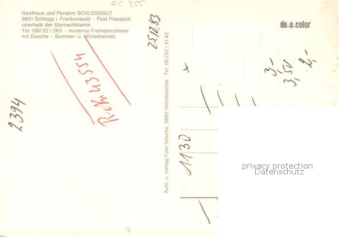 73645216 Schlopp Pension zum Schlossgut Rauschbachtal Steinachtal Gaststube postalisch nicht gelaufen Erhaltung siehe scans [WerneD78] KatCode: 11110009477148