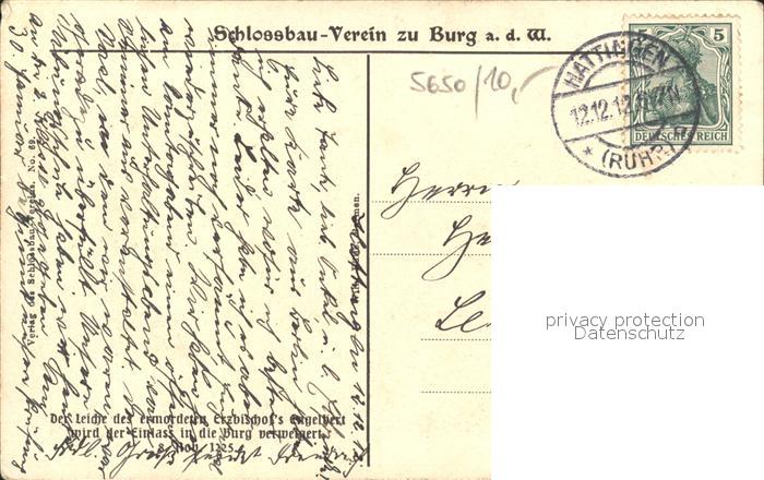 71840063 alte Postkarte Schloss Burg Wupper Leiche Erzbischof Engelbert Einlass Verweigerung Schlossbau-Verein postalisch gelaufen Erhaltung siehe scans KatCode: 11110005122000