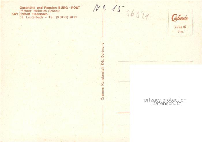 73568890 Schloss Eisenbach Gastst?tte-Pension Burg-Post postalisch nicht gelaufen Erhaltung siehe scans [PaolaD17] KatCode: 11110006535011