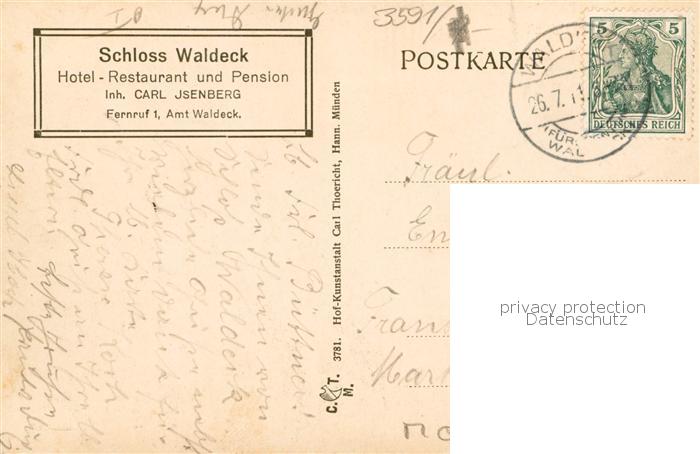 73823303 alte Postkarte Schloss Waldeck Ansicht postalisch gelaufen Erhaltung siehe scans [FriedD77] KatCode: 11110006635021