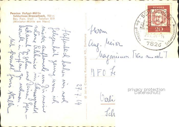 71830453 alte Postkarte Schluchsee Dresselbach Pension Hofgut-Muehle Miniatur-Muehle postalisch gelaufen Erhaltung siehe scans KatCode: 11110008315102