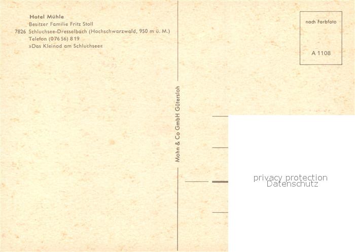 73166964 Schluchsee Drosselbach Hotel Muehle postalisch nicht gelaufen Erhaltung siehe scans [KathaD81] KatCode: 11110008315102